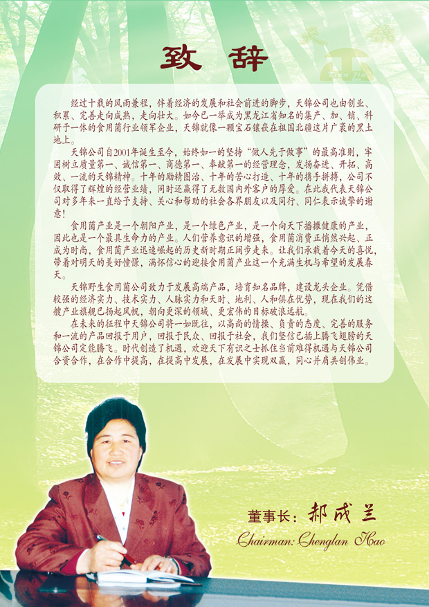 天锦野生食用菌有限公司董事长致辞