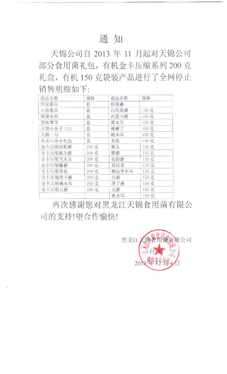 黑龙江天锦食用菌有限公司部分产品停止供货通知