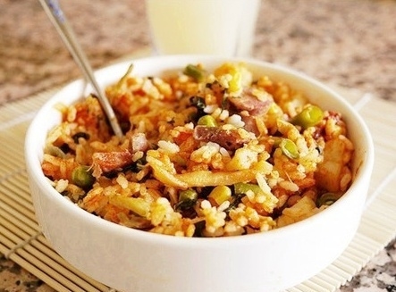 8. 米饭熟后加入红椒,黄椒,青椒丁,再加入盐,鸡精调味,拌匀后出锅。