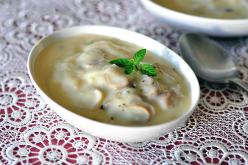 1大蒜切碎;2洋葱切碎;3蘑菇洗净,切片;4用少量豆浆化开面粉,搅拌均匀成豆浆面糊备用;5. 烧热平底锅,不放油,直接煎炒蘑菇片,至两面金黄上色,盛出备用;(锅要热,火要大,迅速煸黄,否则会出水)6. 起炒锅,下入少许色拉油(或黄油),爆香蒜末和洋葱末;7. 加入少许白葡萄酒(或料酒),炒出香味;8. 加入煸炒过的蘑菇片和其余大部分豆浆;9. 加入1片香叶,中火煮至沸腾;10. 加入盐和糖调味;11. 加入豆浆面粉糊,不要一次全部加入哦,少量多次;12. 边加热边搅拌,并适当添加豆浆面糊调整浓度,至汤汁浓稠关火即可。装盘后,撒上适量黑胡椒粉调味。