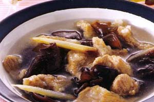 3、锅中加5-6杯水烧开,放入黑木耳及姜片煮半小时左右,至黑木耳微软,加入肉烫煮熟,再加入C料即可。